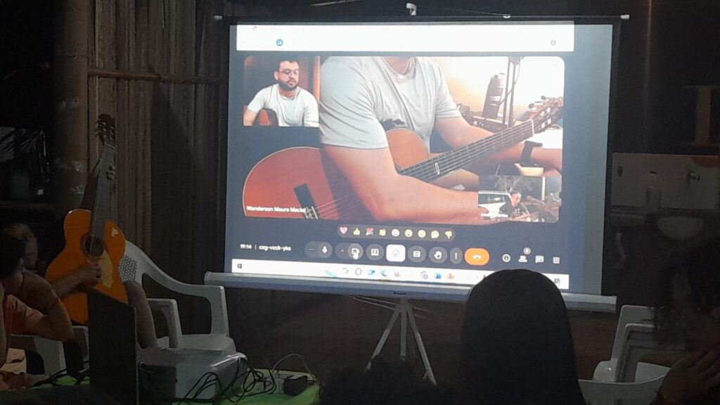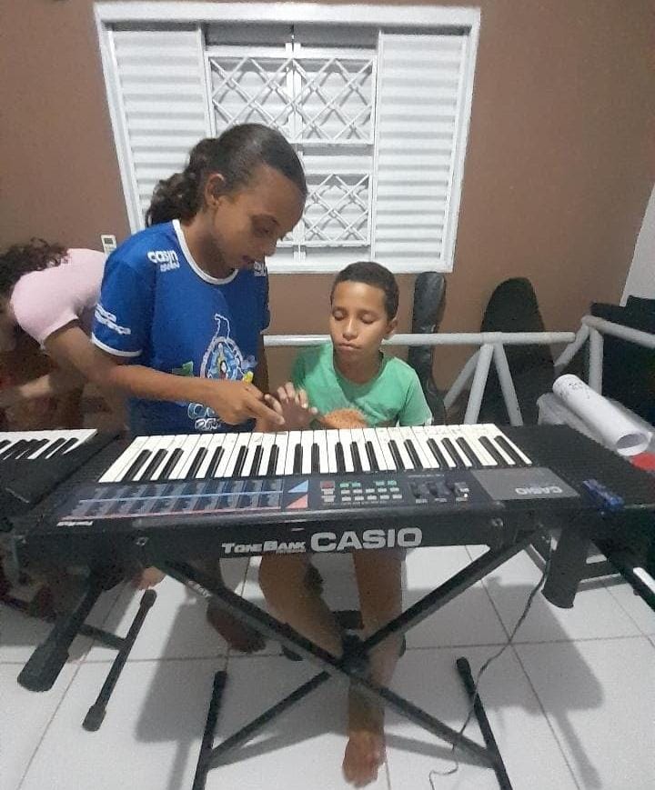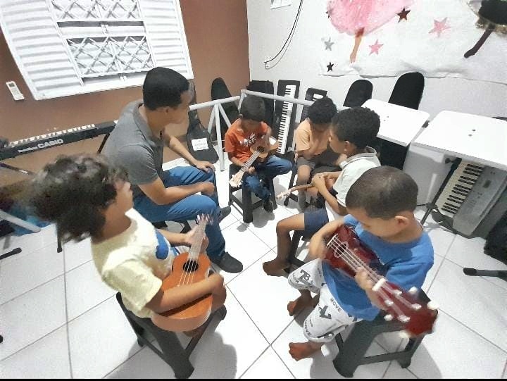 Destaca-se também a contribuição dos músicos Jocel Santiago e Wanderson Moura, graduandos em Licenciatura em Música pela Universidade Federal do Tocantins (UFT). Eles ministram aulas virtuais para os instrutores locais, que repassam os conhecimentos adquiridos aos alunos novatos nas oficinas de violão e bateria, garantindo a qualidade pedagógica das atividades.