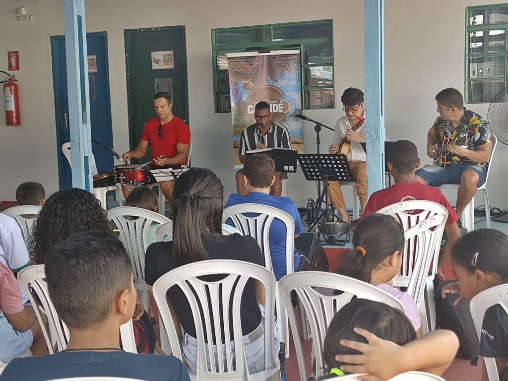 Durante a apresentação, os alunos puderam conhecer mais sobre a origem do choro — um gênero com influências europeias, especialmente italianas, potuguesas, trazidas ao Brasil por imigrantes — e vivenciar sua musicalidade por meio de demonstrações ao vivo e momentos de interação com os músicos.