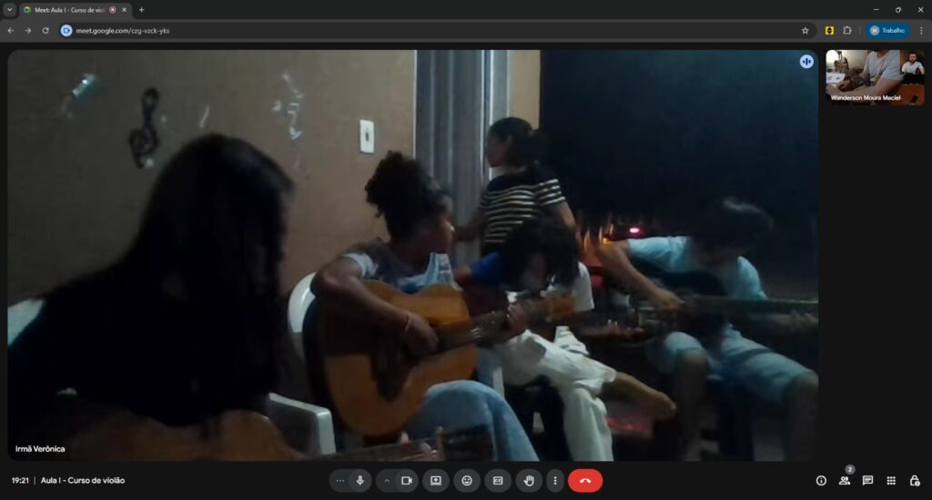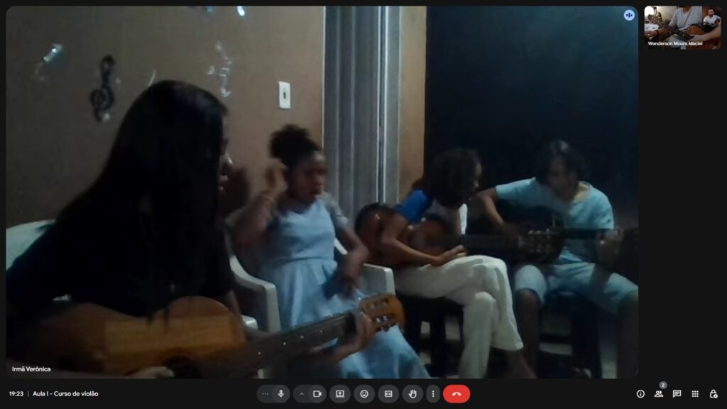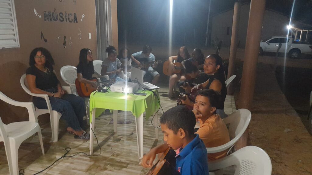 As aulas reúnem crianças, adolescentes e jovens, que têm a oportunidade de aprender teoria e prática musical em instrumentos como violão e bateria, ampliando suas experiências artísticas e fortalecendo vínculos comunitários por meio da música.