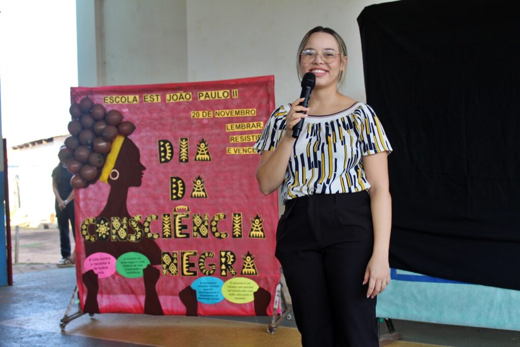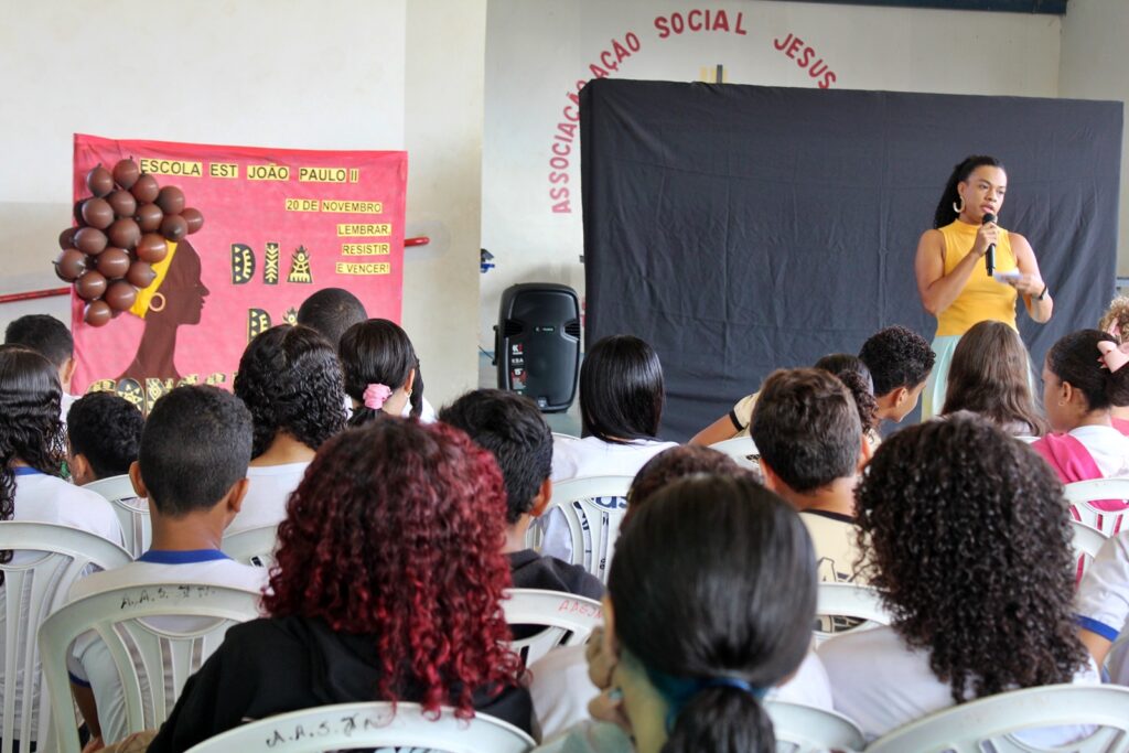 A professora Betiane proferiu uma fala educativa aos estudantes, abordando temas como preconceito, cotas, legislação e o significado do Dia da Consciência Negra. Ela reforçou que a data representa não apenas a resistência, mas também a afirmação histórica e cultural da população negra, evidenciando as desigualdades ainda existentes e a necessidade de enfrentá-las.