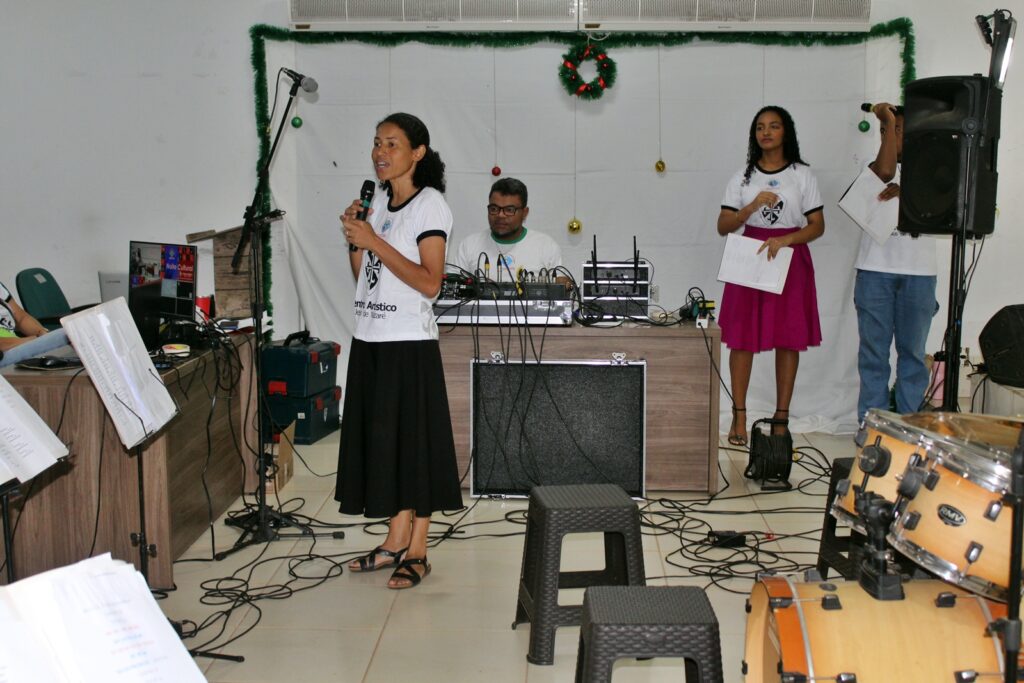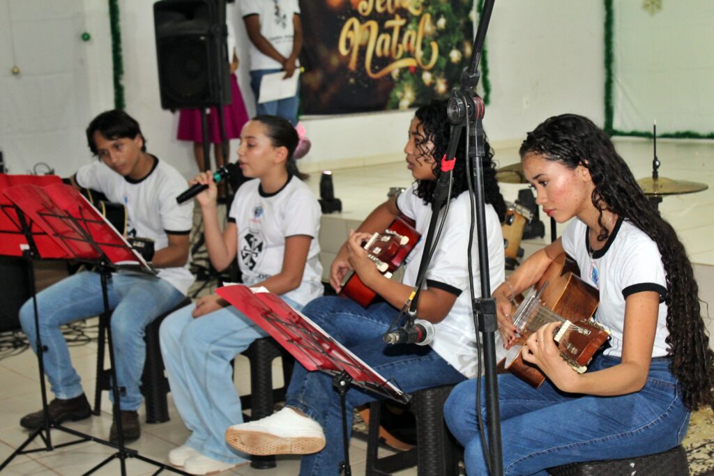 Em seguida, os alunos de violão demonstraram o aprendizado adquirido ao longo do ano, com destaque para a aluna Fabíola Vitória Ribeiro Bernardes, que comoveu os presentes ao interpretar uma canção especial.