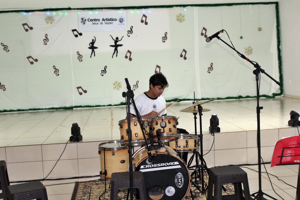 A performance da turma de bateria também chamou a atenção, com um dos alunos conquistando a plateia por meio de ritmo, energia e precisão.